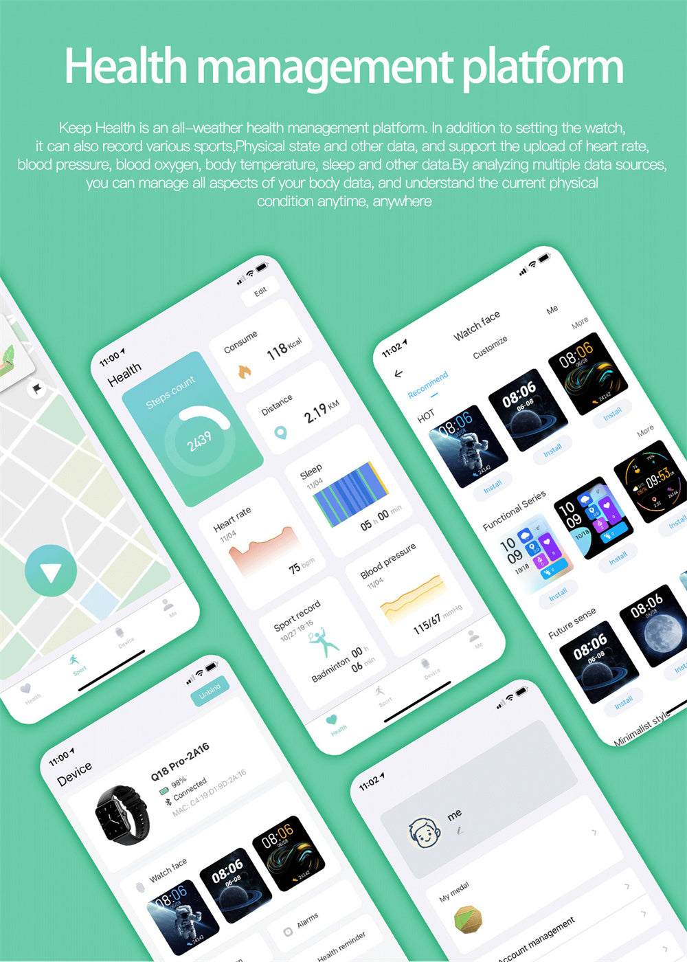 Waterproof level:IP67 Bluetooth:5.2 Battery capacity:340 mAh Operation method:Full screen touch Resolution:240*280 Strap material:Composite silia gel Shell material:Zinc alloy plating Screen:1.69inch TFT Strap size:Short side 90, long side 117mm